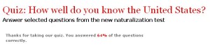 Uh, oh. MSNBC just posted part of the U.S. Naturalization test online. This is slightly embarrasing to admit, but apparently I’m only 64% qualified to be a U.S. Citizen!