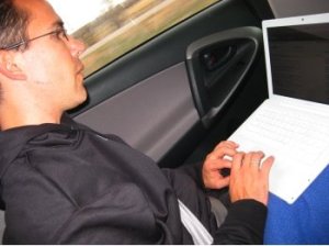 We’re sitting in the back of the car. The iPod is plugged into the stereo. The cell phone, plugged into the lighter, is connected to the internet. This laptop (upon which I am typing) is connected to the cell phone via Bluetooth. We are taking photos, uploading them on the laptop, then posting them on Facebook.