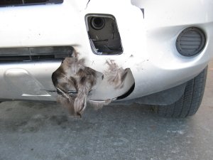 Half of a large goose was mangled into Jamie’s cracked and broken fender.