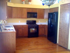 Here’s the kitchen. It’s at least twice as big as our current kitchen with loads more cabinet space. This might be the part of the house I’m most looking forward to. Oh and those beautiful appliances come with it. However, that light fixture in the foreground (which is actually in the dining area) will be one of the first things to be replaced.
