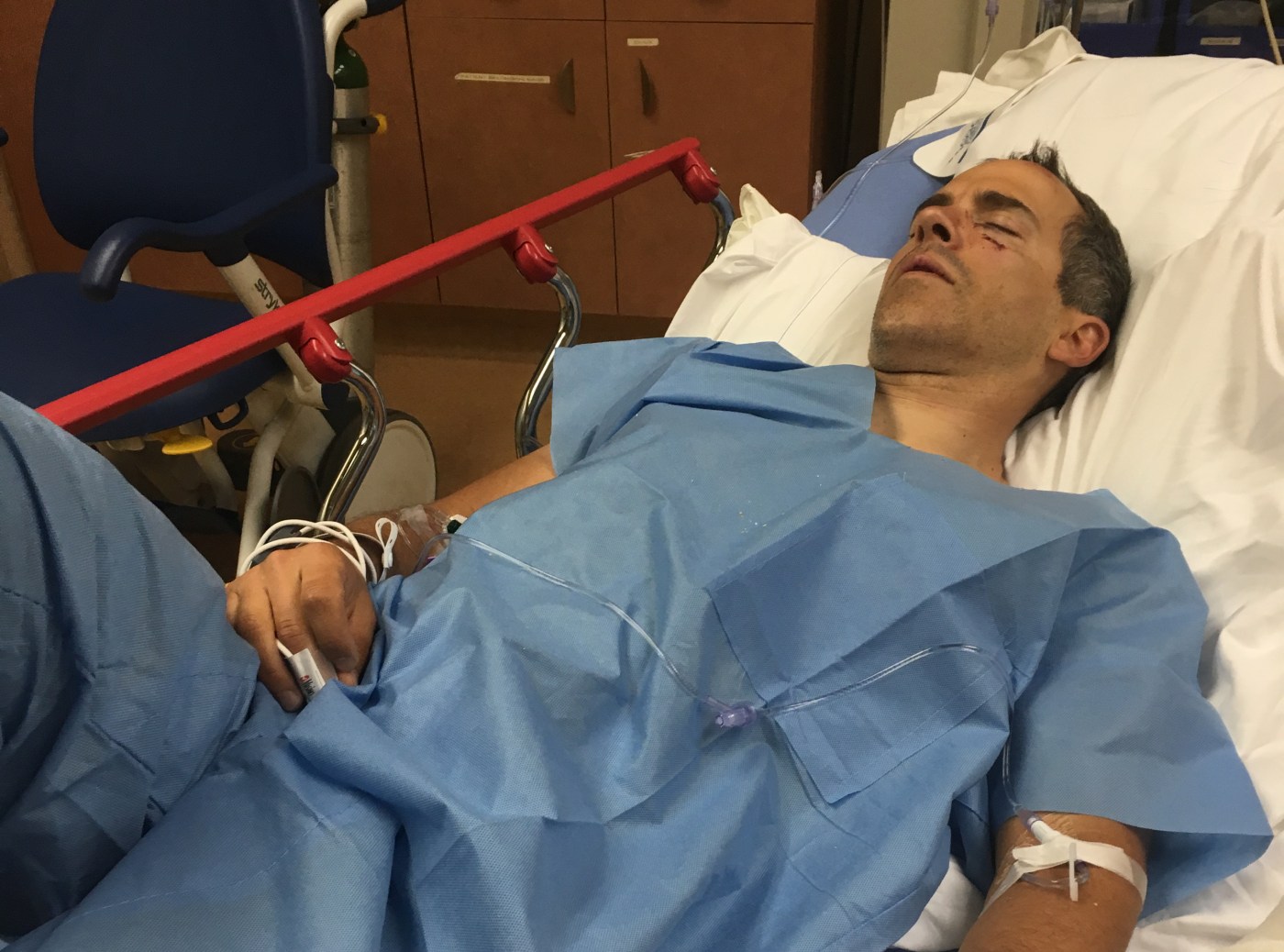 But instead he has a black eye, 35 staples and a pair of crutches.