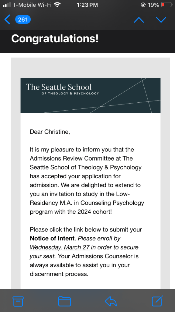 I’m pursuing a Masters in Counseling Psychology at The Seattle School of Theology and Psychology! I have been deeply impacted by the work of Dan Allender and I’m so excited that I will be doing the dual track in Narrative Focused Trauma Care and get to learn directly from him!
